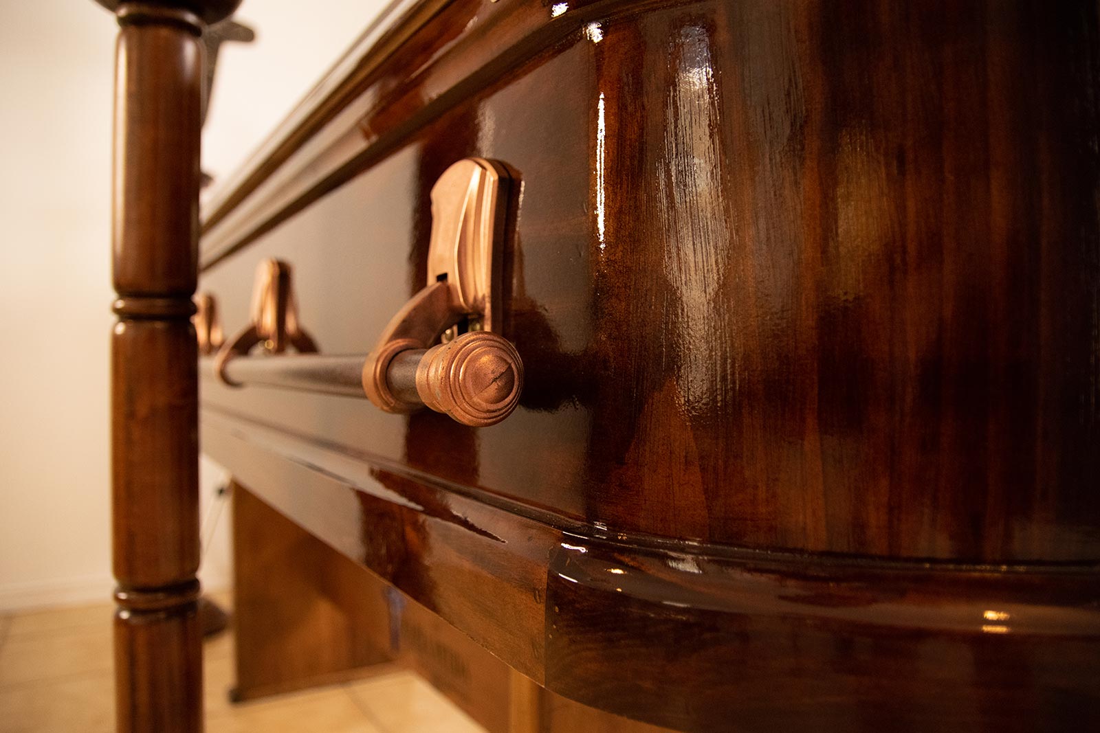 • Urna Modelo Semi Americana, Pino Tratada/Color Nogal Oscuro Brillante.